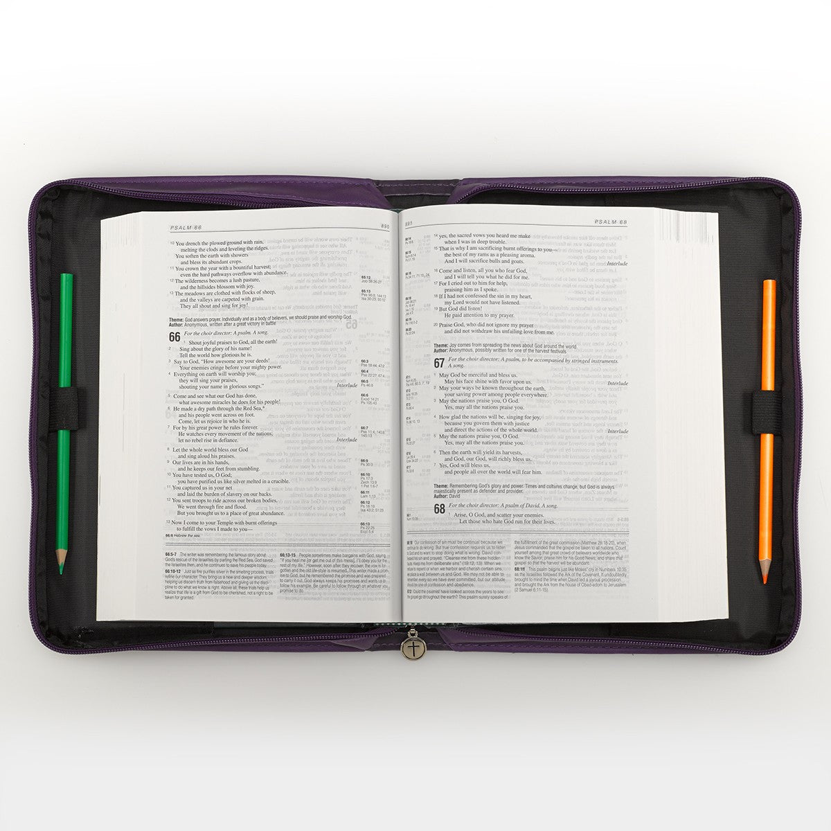 A lay flat faux leather handle ensures that the Bible cover opens flat. Inside, you will find two slip pockets to securely hold your Bible and two pen loops that will keep a pen or pencil handy at all times. A round silver zipper pull that is engraved with a cross adds a little extra elegance.