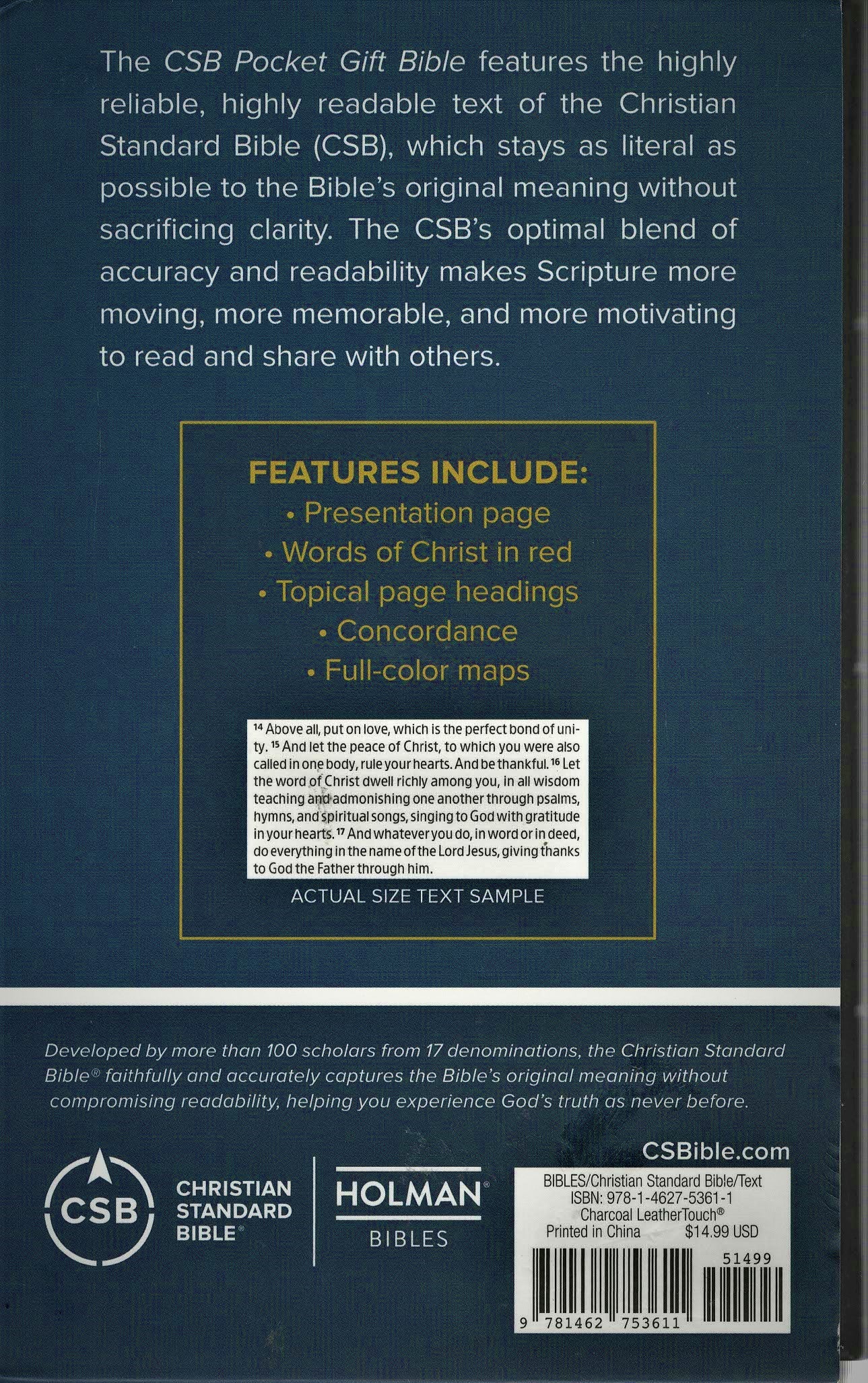 The CSB® Pocket Gift Bible features the highly readable, highly reliable text of the Christian Standard Bible® (CSB). The CSB stays as literal as possible to the Bible's original meaning without sacrificing clarity, making it easier to engage with Scripture's life-transforming message and to share it with others.