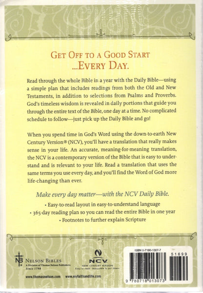 The NCV Daily Bible guides you through the complete Bible in a 365 day reading plan that incorporates passages from the Old Testament, New Testament, Psalms, and Proverbs in each day's reading. Read an Old Testament passage and a Psalm in the morning, a New Testament passage and a Proverb at night, or whatever suits your schedule. The thoroughly accurate yet completely understandable NCV makes reading the Bible in a year 100% doable.