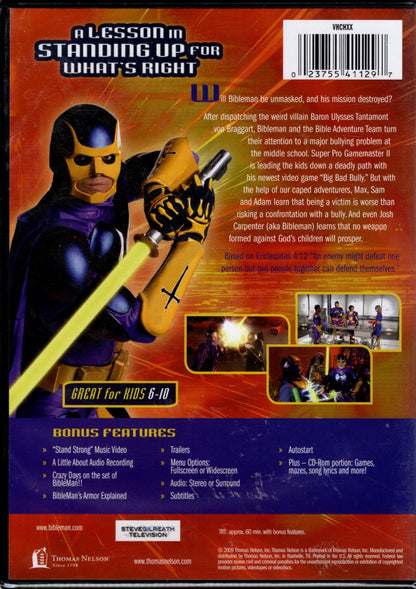 After dispatching the weird villain Baron Ulysses Tantamont von Braggart, BibleMan and the Bible Adventure Team turn their attention to a major bullying problem at the middle school. Super Pro Gamemaster II is leading the kids down a deadly path with his newest video game "Big Bad Bully." But with the help of our caped adventurers, Max, Sam and Adam learn that being a victim is worse than risking a confrontation with a bully. And even Josh Carpenter (aka BibleMan) learns that no weapon formed against God's children will prosper.