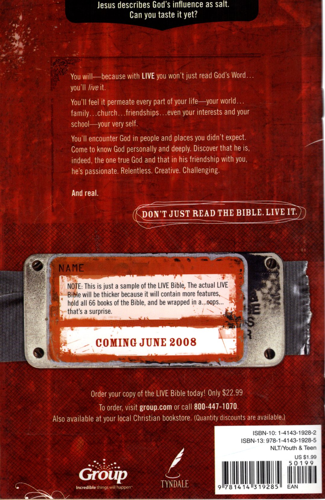 This Gospel of John in the New Living Translation® is just a sample of the LIVE Bible. The actual LIVE Bible will be thicker because it will contain more features, hold all 66 books of the Bible, and be wrapped in a ...oops...that's a surprise. COMING JUNE 2008