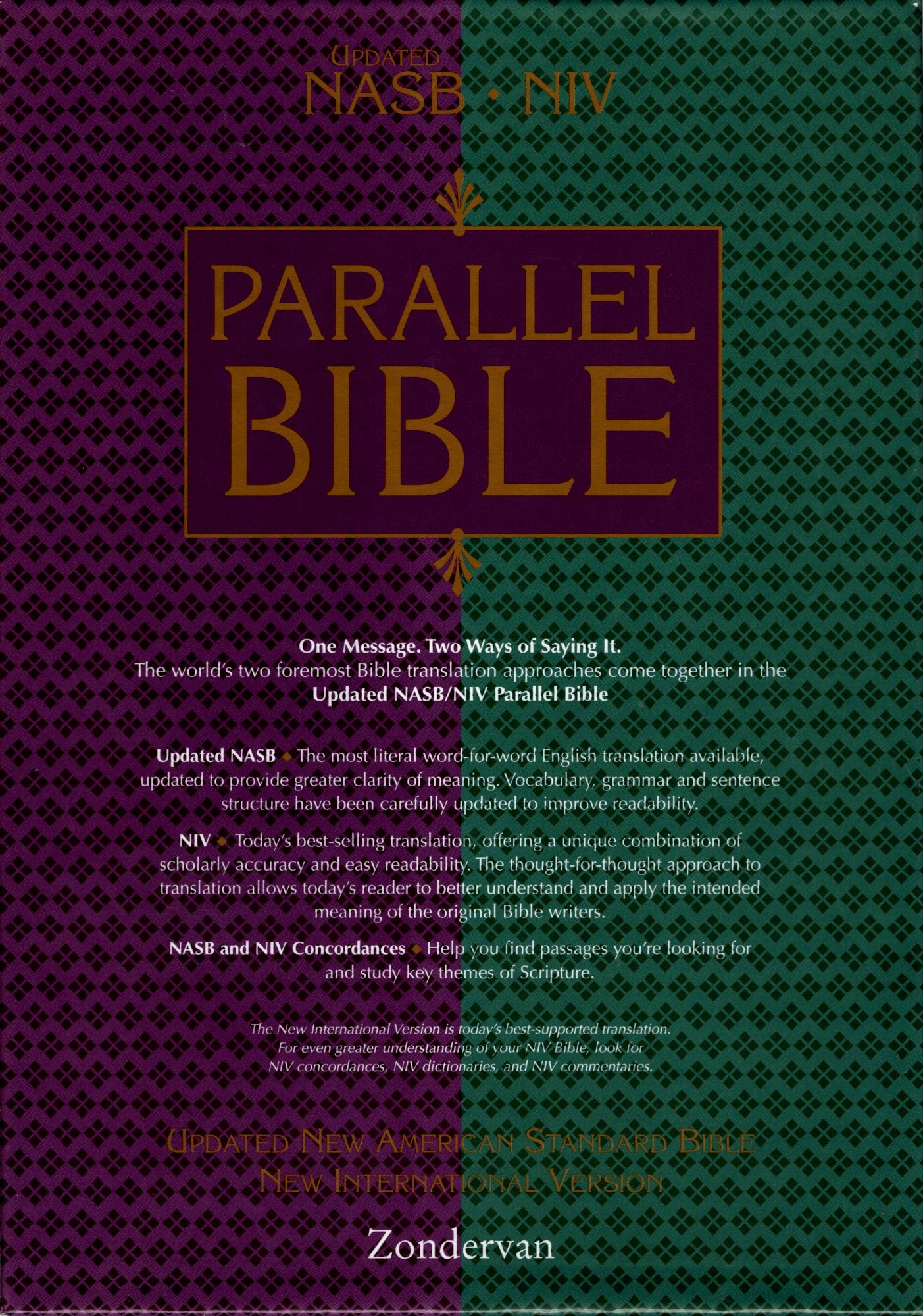 One Message. Two Ways of Saying It. The world's two foremost Bible translation approaches come together in the Updated NASB/NIV Parallel Bible. This Bible does more than give you two highly respected Bible translations--it lets you access the strengths of the two most trusted translation approaches. The word-for-word literal method of the updated New American Standard Bible (NASB) lets you see what the original authors of the Bible wrote. The thought-for-thought approach of the New International Version® (NIV) gives an accurate understanding of what they meant. The Updated NASB/NIV Parallel Bible sets the two methods side-by-side for you to compare and contrast, allowing you to gain insight from the distinctive nuances of meaning of each translation.