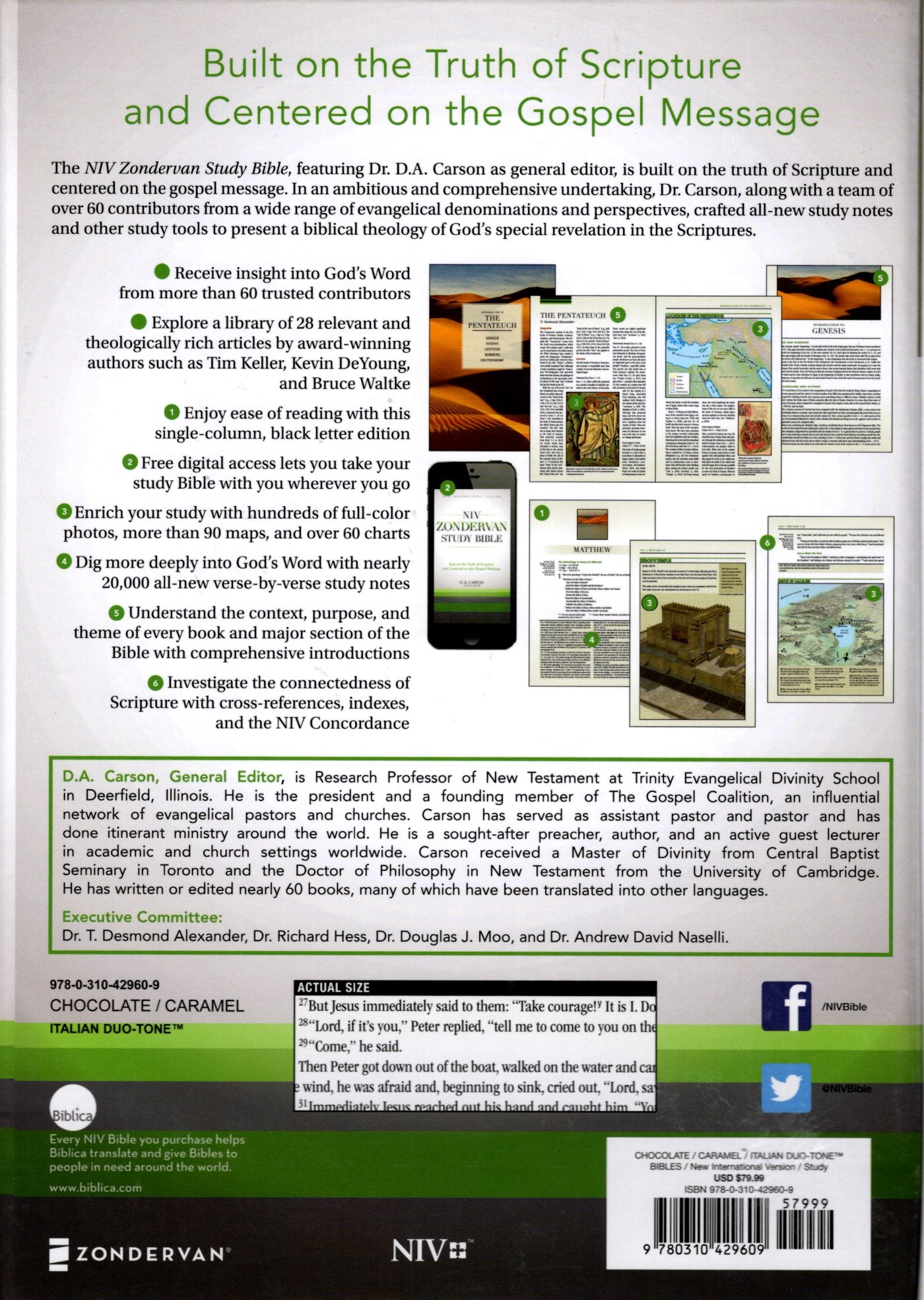The NIV® Zondervan Study Bible, featuring Dr. D. A. Carson as general editor, is built on the truth of Scripture and centered on the gospel message. An ambitious and comprehensive undertaking, Dr. Carson, with committee members Dr. T. Desmond Alexander, Dr. Richard S. Hess, Dr. Douglas J. Moo, and Dr. Andrew David Naselli, along with a team of over 60 contributors from a wide range of evangelical denominations and perspectives, crafted all-new study notes and other study tools to present a biblical theology of God’s special revelation in the Scriptures. To further aid the readers’ understanding of the Bible, also included are full-color maps, charts, photos and diagrams. In addition, a single-column setting of the Bible text provides maximum readability.