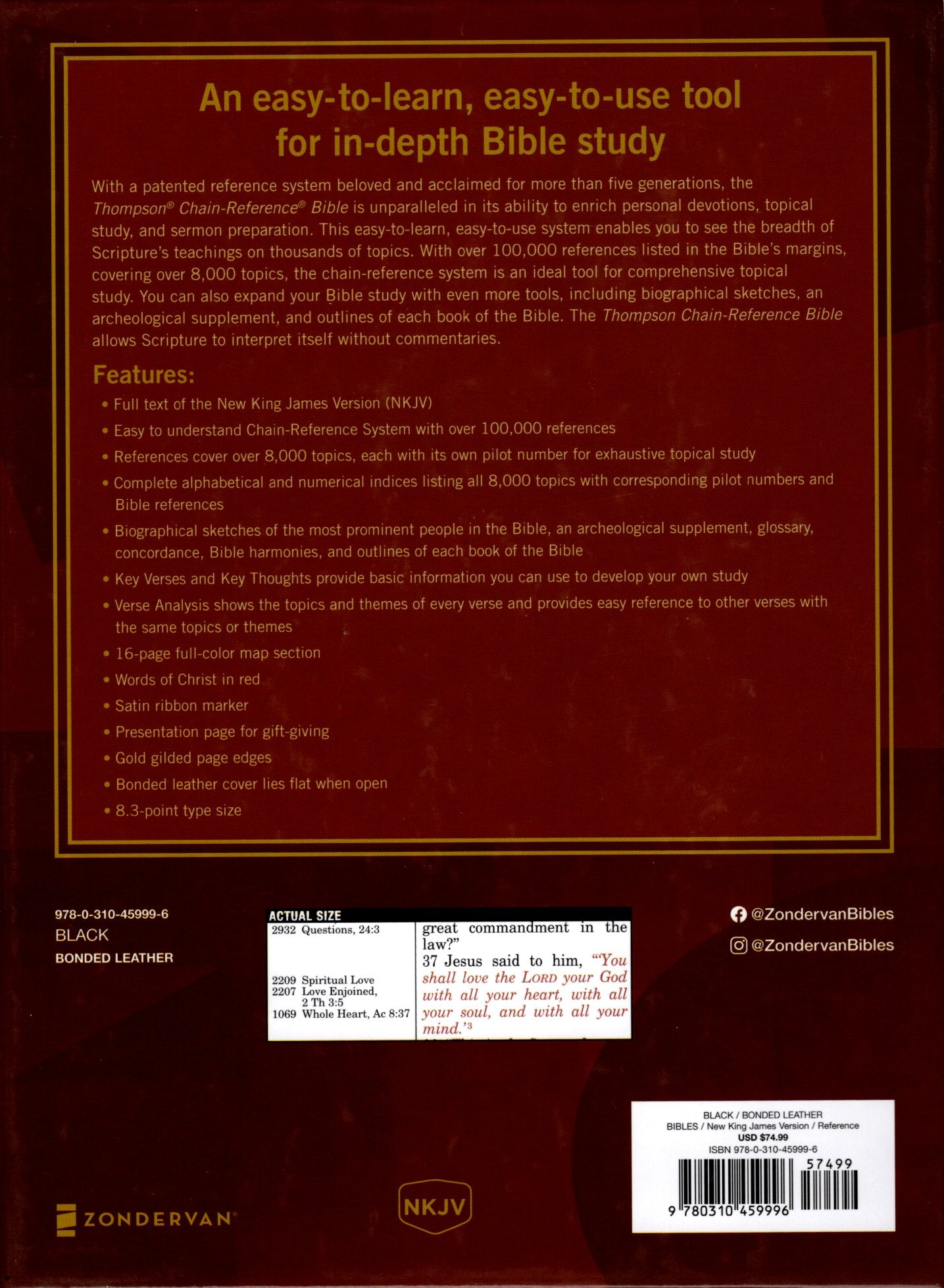 With a patented reference system beloved and acclaimed for more than five generations, the Thompson® Chain-Reference® Bible is unparalleled in its ability to enrich personal devotions, topical study, and sermon preparation. This easy-to-learn, easy-to-use system enables you to see the breadth of Scripture’s teachings on thousands of topics. With over 100,000 references listed in the Bible’s margins, covering over 8,000 topics, the chain-reference system is an ideal tool for comprehensive topical study. You can also expand your Bible study with even more tools, including biographical sketches, an archeological supplement, and outlines of each book of the Bible. The Thompson® Chain-Reference® Bible allows Scripture to interpret itself without commentaries.